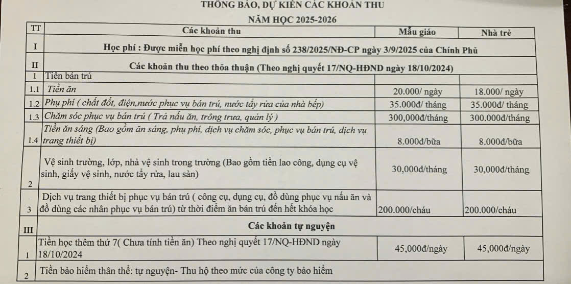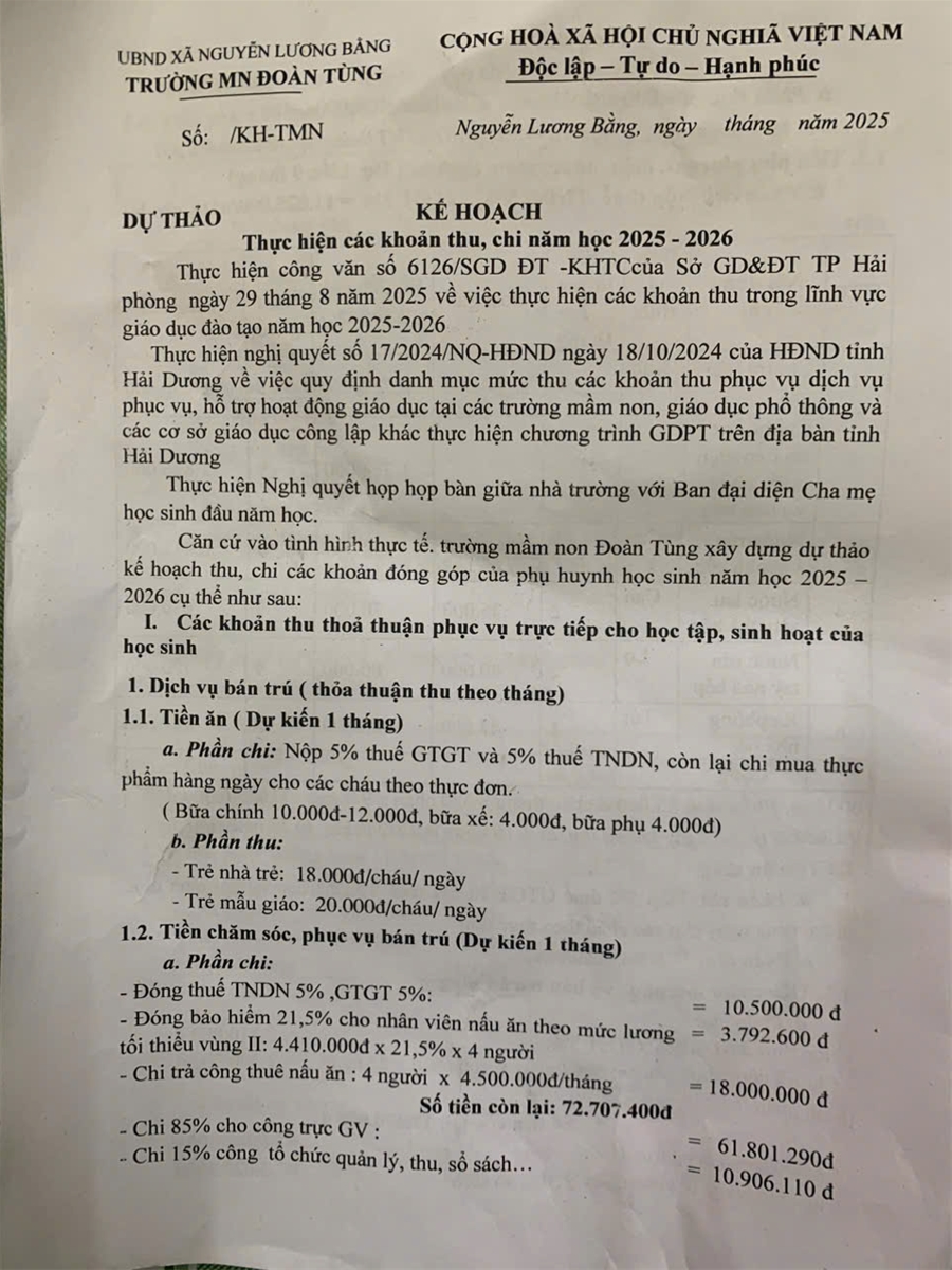 Thực hiện theo chủ trương của Ngành Giáo dục và Đào tạo về việc công khai, minh bạch trong các khoản thu chi tài chính, Trường Mầm non Đoàn Tùng xin thông tin tới toàn thể phụ huynh và nhân dân về dự thảo kế hoạch vận động tài trợ cũng như dự kiến các khoản thu trong năm học 2025 – 2026 như sau: